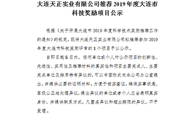 大連天正實業有限公司推薦2019年度大連市科技獎勵項目公示